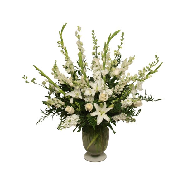 De magestueux lys blanc, glaieul blanc, rose blanche et autres fleurs blanches magnifiques dans un vase clair ayant beaucoup de prestance. Cet arrangement floral offrira vos sympathies les plus sincères.
