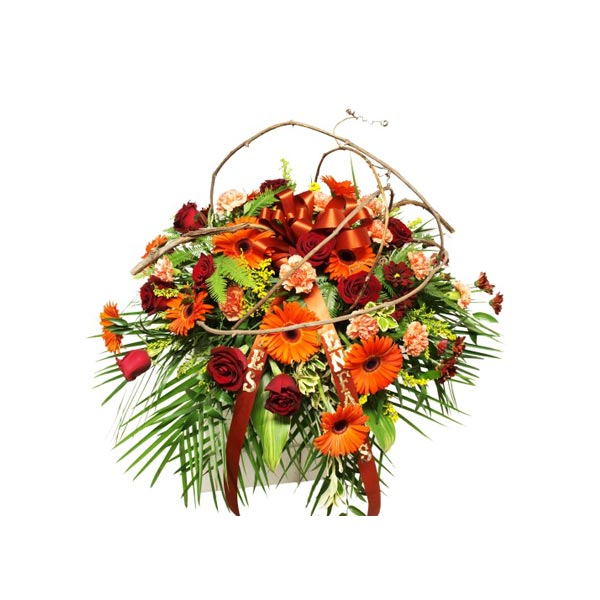 Dites au revoir à l'être cher en déposant ce magnifique coussin sur sa tombe. Composé de gerbera orangé, d'oeillet saumon, de magnifique rose rouge ainsi que d'une touche de solidago jaune soleil. Ce coussin rappellera aux gens comment le défunt était une personne exceptionnelle.