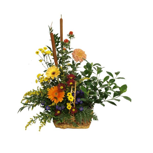 Offrez cette corbeille de rotin contenant un magnifique mélange de fleurs coupées ainsi qu'une plante verte vivace. Avec ses couleurs chaudes et éclatantes elle illuminera le visage de la personne chère!