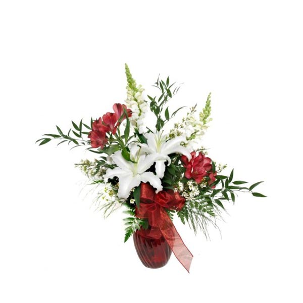 Cet arrangement de lys blanc et de alstromeria rouge disposé dans un magnifique vase en verre rouge aura un effet monstre. De l'amour et de l'affection rempliront la pièce.