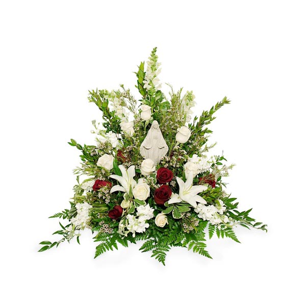Vous vivez la perte d'un être cher, vous cherchez les fleurs parfaites pour souligner l'oeuvre de sa vie? Ne cherchez plus, cet arrangement pour urne convient parfaitement autant aux hommes qu'aux femmes. Avec sa vierge Marie, il est d'une sobriété très classique.