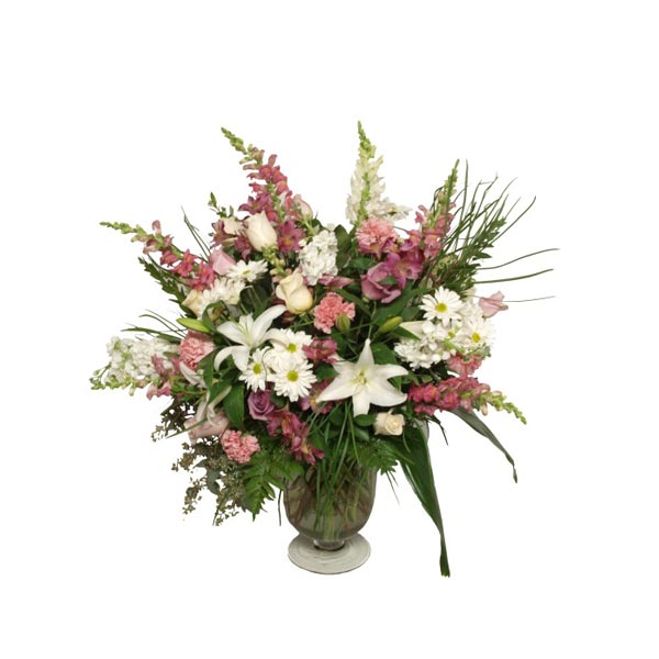 Des lys blancs, de jolies roses lavande, mufflier rose et blanc ainsi qu'une délicate touche d'oeillet de teinte rosé. Ce magnifique bouquet est parfait pour commémorer le souvenir d'une personne qui nous était chère.