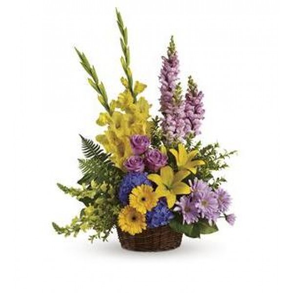 Ce mélange élégant et édifiant de fleurs de sympathie pour le service regorge de couleurs. L'arrangement haut comprend un éventail de fleurs qui toucheront le cœur de tout le monde, disposées de manière artistique dans un panier de sympathie.