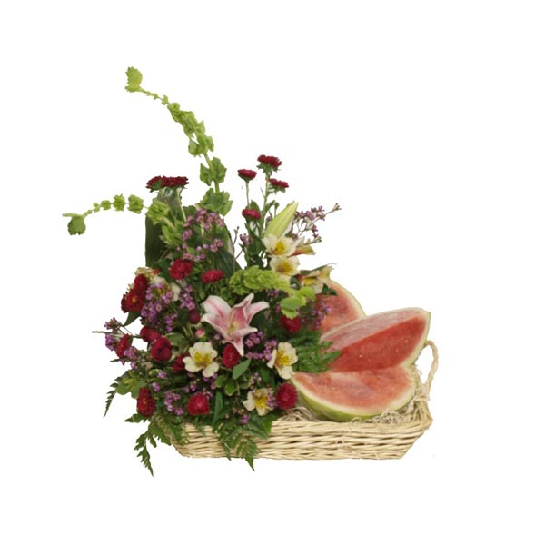Vous ne pouvez vous décidez entre des fleurs et des fruits, offrez ce délicieux mélange. Comblez plusieurs de ses sens avec cette composition de fruits et de fleurs.