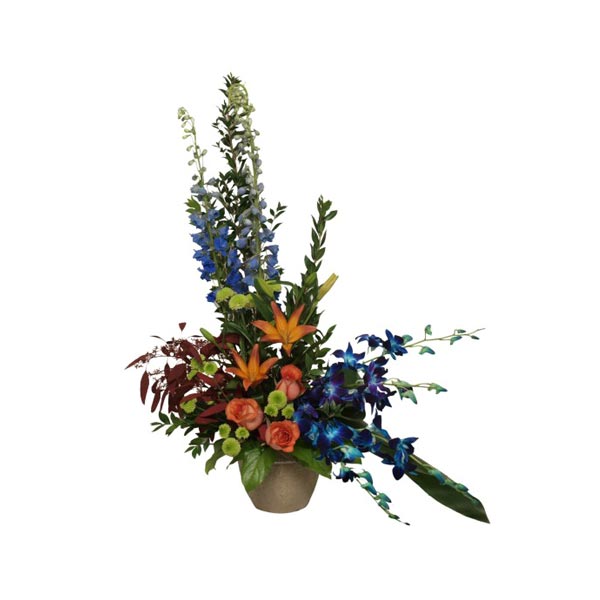 Ce vase magnifique composé de lys orangé, d'orchidée dendrobium bleu électrique, de rose corail et d'une touche d'eucalyptus est parfait pour le salon funéraire.