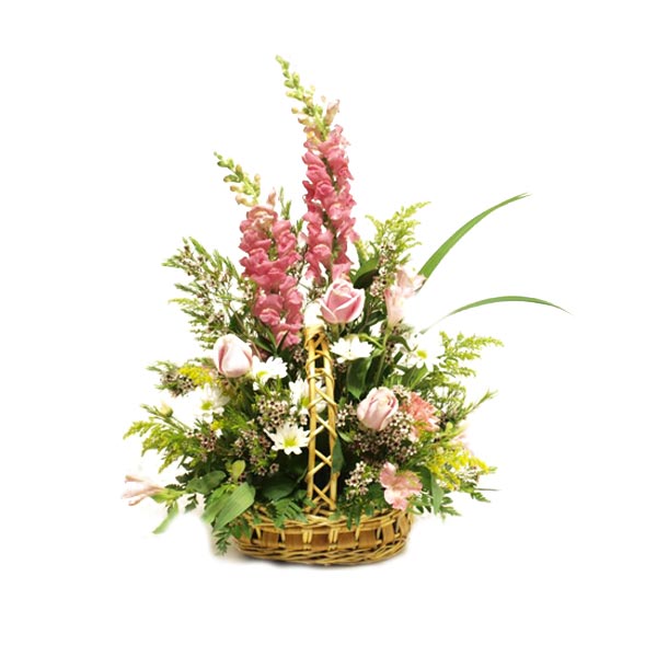 Dans les teintes de roses et blanc, ce merveilleux panier de fleurs est un excellent choix.