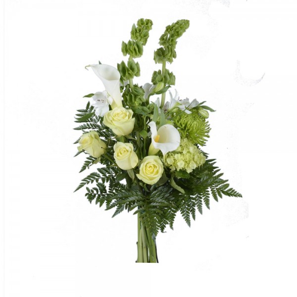 Emballage comprenant un magnifique assortiment de fleurs celle-ci toutes dans les teintes de vert.