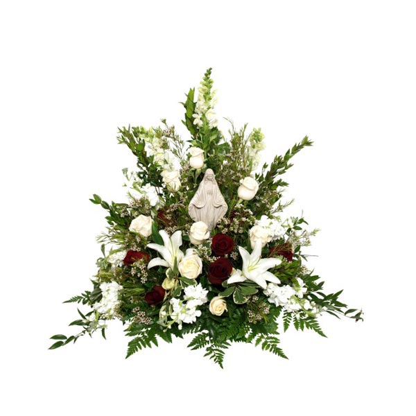 Pour des condoléances plus que sincères offrez cette arrangement incluant une madone. Avec ces lys blancs, ces roses blanches agrémenté d'une magnifique verdure. Le tout est sobre et surtout très classique.